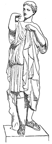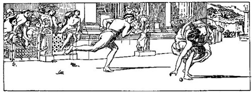 The virgin darted forward. As she ran she looked more beautiful than ever. The breezes gave wings to her feet; her hair flew over her shoulders, and the gay fringe of her garment fluttered behind her. A ruddy hue tinged the whiteness of her skin, such as a crimson curtain casts on a marble wall. Her competitor was distanced and was put to death without mercy. Hippomenes, not daunted by this result, fixed his eyes on the virgin and said, "Why boast of beating those laggards? I offer myself for the contest." Atalanta looked at him with pity in her face and hardly knew whether she would rather conquer so goodly a youth or not. While she hesitated, the spectators grew impatient for the contest and her father prompted her to prepare. Then Hippomenes addressed a prayer to Cypris: "Help me, Venus, for thou hast impelled me." Venus heard and was propitious.