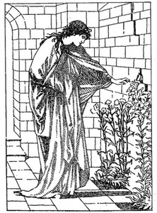 Yet while he stood, and knew not what to doWith yearning, a strange thrill of hope there came,A shaft of new desire now pierced him through,And therewithal a soft voice called his name,And when he turned, with eager eyes aflame,He saw betwixt him and the setting sunThe lively image of his lovèd one.He trembled at the sight, for though her eyes,Her very lips, were such as he had made,And though her tresses fell but in such guiseAs he had wrought them, now was she arrayedIn that fair garment that the priests had laidUpon the goddess on that very morn,Dyed like the setting sun upon the corn.Speechless he stood, but she now drew anear,Simple and sweet as she was wont to be,And once again her silver voice rang clear,Filling his soul with great felicity,And thus she spoke, "Wilt thou not come to me,O dear companion of my new-found life,For I am called thy lover and thy wife?.."My sweet," she said, "as yet I am not wise,Or stored with words aright the tale to tell,But listen: when I opened first mine eyesI stood within the niche thou knowest well,And from my hand a heavy thing there fellCarved like these flowers, nor could I see things clear,But with a strange, confusèd noise could hear."At last mine eyes could see a woman fair,But awful as this round white moon o'erhead,So that I trembled when I saw her there,For with my life was born some touch of dread,And therewithal I heard her voice that said,'Come down and learn to love and be alive,For thee, a well-prized gift, to-day I give.'"138A fuller account of Venus' address to the statue is the following: