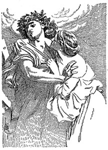 Hymen was called to bless with his presence the nuptials of Orpheus with Eurydice, but he conveyed no happy omens with him. His torch smoked and brought tears into the eyes. In keeping with such sad prognostics, Eurydice, shortly after her marriage, was seen by the shepherd Aristæus, who was struck with her beauty and made advances to her. As she fled she trod upon a snake in the grass, and was bitten in the foot. She died. Orpheus sang his grief to all who breathed the upper air, both gods and men, and finding his complaint of no avail, resolved to seek his wife in the regions of the dead. He descended by a cave situated on the side of the promontory of Tænarus, and arrived in the Stygian realm. He passed through crowds of ghosts and presented himself before the throne of Pluto and Proserpine. Accompanying his words with the lyre, he sang his petition for his wife. Without her he would not return. In such tender strains he sang that the very ghosts shed tears. Tantalus, in spite of his thirst, stopped for a moment his efforts for water, Ixion's wheel stood still, the vulture ceased to tear the giant's liver, the daughters of Danaüs rested from their task of drawing water in a sieve, and Sisyphus sat on his rock to listen.156 Then for the first time, it is said, the cheeks of the Furies were wet with tears. Proserpine could not resist and Pluto himself gave way. Eurydice was called. She came from among the new-arrived ghosts, limping with her wounded foot. Orpheus was permitted to take her away with him on condition that he should not turn round to look at her till they should have reached the upper air. Under this condition they proceeded on their way, he leading, she following. Mindful of his promise, without let or hindrance the bard passed through the horrors of hell. All Hades held its breath.