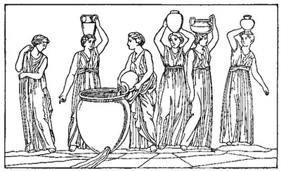 150. The Danaïds. 201 Ægyptus and his fifty sons drove Danaüs and his fifty daughters back to Argos, the ancestral home of the race. Finally, a reconciliation was arranged by means of a fiftyfold marriage between the sons of Ægyptus and the Danaïds. But in accordance with a treacherous command of Danaüs, all his daughters save Hypermnestra slew their husbands on the wedding night. For this crime the forty-nine Danaïds were condemned to spend eternity in Tartarus, trying to fill with water a vessel full of holes. From Hypermnestra and her husband, Lynceus, was sprung the royal house of Argos. Their son was Abas, their grandson, Acrisius, – of whom the following narrative is told.