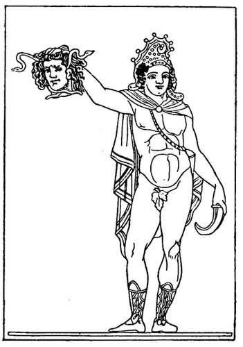 152. Perseus and Medusa. 203 When Perseus was grown up, Polydectes sent him to attempt the conquest of the Gorgon Medusa,204 a terrible monster who had laid waste the country. She had once been a maiden whose hair was her chief glory, but as she dared to vie in beauty with Minerva, the goddess deprived her of her charms and changed her ringlets into hissing serpents. She became a monster of so frightful an aspect that no living thing could behold her without being turned into stone. All around the cavern where she dwelt might be seen the stony figures of men and animals that had chanced to catch a glimpse of her and had been petrified at the sight. Perseus, favored by Minerva and Mercury, set out against the Gorgon, and approached first the cave of the three Grææ: