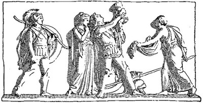 207. Hector and Andromache. The Trojans being still pushed nearer to their own walls, Hector, bravest of Priam's sons, returns to the city to urge the women to prayer, and to carry the loitering Paris back with him to the defense. Here he meets his brave mother Hecuba, and then the fair Helen; but most to our purpose and his, his wife, the white-armed Andromache, the noblest of the women of the Iliad, for whom he has searched in vain.