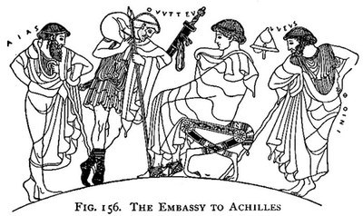 Then Agamemnon, king of men, called another council of his wisest and bravest chiefs and, grievously discouraged, proposed, this time in earnest, that they reëmbark and sail home to Greece.292 In the debate that ensued Nestor advised that an embassy should be sent to Achilles persuading him to return to the field; and that Agamemnon should yield the maiden, the cause of dispute, with ample gifts to atone for the wrong he had done. Agamemnon assented; and Ulysses, Ajax, and Phœnix were sent to carry to Achilles the penitent message. They performed that duty, but Achilles was deaf to their entreaties. He positively refused to return to the attack and persisted in his determination to embark for Greece without delay.
