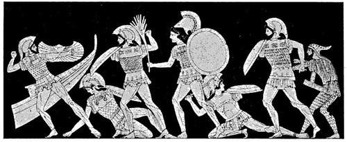 211. Patroclus in the Armor of Achilles. Patroclus, strongly moved by this address, hastened to his friend, revolving in his mind what he had seen and heard.299 He told the prince the sad condition of affairs at the camp of their late associates; Diomede, Ulysses, Agamemnon, Machaon, all wounded, the rampart broken down, the enemy among the ships preparing to burn them and thus to cut off all means of return to Greece. While they spoke, the flames burst forth from one of the ships. Achilles, at the sight, relented so far as to intrust Patroclus with the Myrmidons for the onslaught and to lend him his armor that he might thereby strike the more terror into the minds of the Trojans. Without delay the soldiers were marshaled, Patroclus put on the radiant armor, mounted the chariot of Achilles, and led forth the men ardent for battle. But before his friend went, Achilles strictly charged him to be content with repelling the foe. "Seek not," said he, "to press the Trojans without me, lest thou add still more to the disgrace already mine." Then exhorting the troops to do their best, he dismissed them full of ardor to the fight.