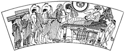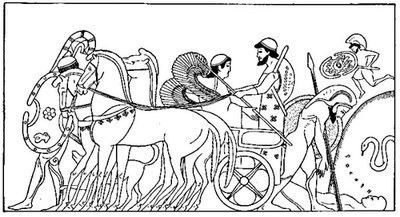 While Achilles indulged his wrath in thus disgracing Hector, Jupiter in pity summoned Thetis to his presence. Bidding her prevail on Achilles to restore the body of Hector to the Trojans, he sent Iris to encourage Priam to beg of Achilles the body of his son. Iris delivered her message, and Priam prepared to obey. He opened his treasuries and took out rich garments and cloths, with ten talents in gold and two splendid tripods and a golden cup of matchless workmanship. Then he called to his sons and bade them draw forth his litter and place in it the various articles designed for a ransom to Achilles. When all was ready, the old king with a single companion as aged as himself, the herald Idæus, drove forth from the gates, parting there with Hecuba his queen, and all his friends, who lamented him as going to certain death.