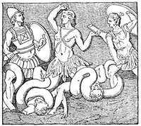240. The Cattle of the Sun. Both Tiresias and Circe had warned him of another danger. After passing Scylla and Charybdis the next land he would make was Thrinacia, an island whereon were pastured the cattle of Helios, the Sun, tended by his daughters Lampetia and Phaëthusa. These flocks must not be violated, whatever the wants of the voyagers might be. If this injunction were transgressed, destruction was sure to fall on the offenders. Ulysses would willingly have passed the island of the Sun without stopping, but his companions so urgently pleaded for the rest and refreshment that would be derived from anchoring and passing the night on shore, that Ulysses yielded. He made them swear, however, not to touch the sacred flocks and herds, but to content themselves with what provision they yet had left of the supply which Circe had put on board. So long as this supply lasted the people kept their oath; but contrary winds detained them at the island for a month, and after consuming all their stock of provisions, they were forced to rely upon the birds and fishes they could catch. Famine pressed them, and at last, in the absence of Ulysses, they slew some of the cattle, vainly attempting to make amends for the deed by offering from them a portion to the offended powers. Ulysses, on his return to the shore, was horror-struck at perceiving what they had done, and the more so on account of the portentous signs which followed. The skins crept on the ground, and the joints of meat lowed on the spits while roasting.