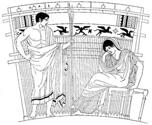 Ulysses and Penelope had not enjoyed their union more than a year when it was interrupted by the events which called Ulysses to the Trojan War. During his long absence, and when it was doubtful whether he still lived, and highly improbable that he would ever return, Penelope was importuned by numerous suitors, from whom there seemed no refuge but in choosing one of them for her husband. She, however, employed every art to gain time, still hoping for Ulysses' return. One of her arts of delay was by engaging in the preparation of a robe for the funeral canopy of Laërtes, her husband's father. She pledged herself to make her choice among the suitors when the web was finished. During the day she worked at it, but in the night she undid the work of the day.