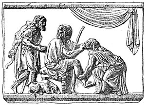 Once again was the wanderer all but betrayed; – when his aged nurse Euryclea, bathing his feet, recognized the scar of a wound dealt him by a boar, long ago.351 Grief and joy overwhelmed the crone, and she would have revealed him to Penelope had not Ulysses enjoined silence upon her.