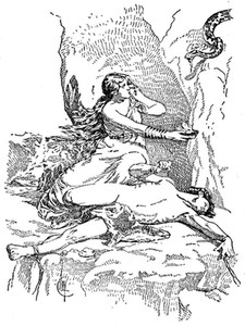 But Loki did not escape his merited punishment. When he saw how wroth the gods were, he fled to the mountain and there built himself a hut with four doors, so that he could see every approaching danger. He invented a net to catch the fishes, such as fishermen have used since his time. But Odin found out his hiding place and the gods assembled to take him. He, seeing this, changed himself into a salmon and lay hid among the stones of the brook. But the gods took his net and dragged the brook, and Loki, finding he must be caught, tried to leap over the net; but Thor caught him by the tail, and compressed it so that salmon ever since have had that part remarkably fine and thin. They bound him with chains and suspended a serpent over his head, whose venom falls upon his face drop by drop. His wife, Siguna, sits by his side and catches the drops as they fall, in a cup; but when she carries it away to empty it, the venom falls upon Loki, which makes him howl with horror and writhe so that the whole earth shakes.