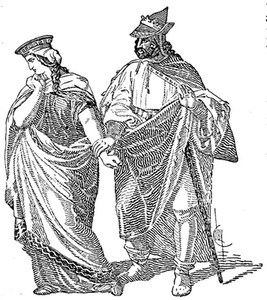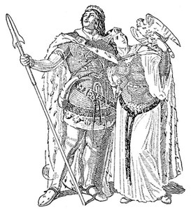 "Whoe'er own this hearth,Here must I rest me."He remains stretched out motionless. A woman enters from an inner chamber. It is Sieglinde. She takes compassion on the helpless fugitive, admires his noble bearing, gives him drink, and bids him tarry till her husband be home. They gaze upon each other with ever-increasing interest and emotion. Suddenly Siegmund starts up as if to go.