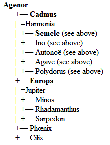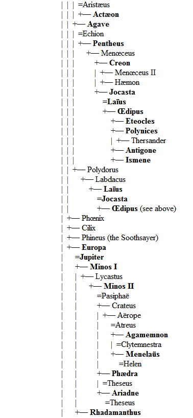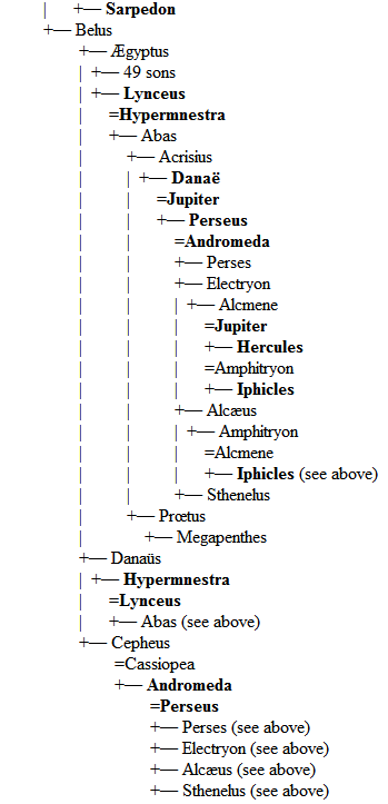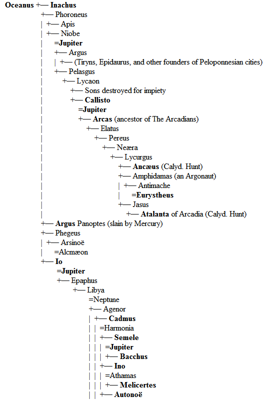 57. In the following general table of the Race of Inachus (see p. 488), marriages are indicated in the usual manner (by the sign =, or by parentheses); the more important characters mentioned in this work are printed in heavy-faced type. While numerous less important branches, families, and mythical individuals have been intentionally omitted, it is hoped that this reduction of various relationships, elsewhere explained or tabulated, to a general scheme, may furnish the reader with a clearer conception of the family ties that motivate many of the incidents of mythical adventure, and that must have been commonplaces of information to those who invented and perpetuated these stories. It should be borne in mind that the traditions concerning relationships are by no means consistent, and that consequently the collation of mythical genealogies demands the continual exercise of discretion, and a balancing of probabilities. Notice that from the union of Jupiter and Io (Table D), Hercules is descended in the thirteenth generation.