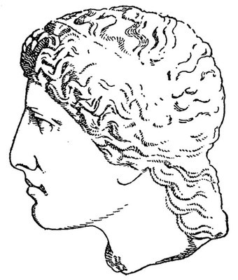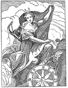 Queen and Huntress, chaste and fair,Now the sun is laid to sleep,Seated in thy silver chairState in wonted manner keep:Hesperus entreats thy light,Goddess excellently bright.Earth, let not thy envious shadeDare itself to interpose;Cynthia's shining orb was madeHeaven to clear when day did close:Bless us then with wishèd sight,Goddess excellently bright.Lay thy bow of pearl apart,And thy crystal-shining quiver;Give unto the flying hartSpace to breathe, how short soever:Thou that mak'st a day of night,Goddess excellently bright.3134. Venus (Aphrodite), goddess of love and beauty, was, according to the more ancient Greek conception, a daughter of Jupiter and Dione;32 but Hesiod says that she arose from the foam of the sea at the time of the wounding of Uranus, and therefore was called, by the Greeks, Aphrodite, the foam-born.33 Wafted by the west wind, and borne upon the surge, she won first the island of Cythera; thence, like a dream, she passed to Cyprus, where the grace and blossom of her beauty conquered every heart. Everywhere, at the touch of her feet the herbage quivered into flower. The Hours and Graces surrounded her, twining odorous garlands and weaving robes for her that reflected the hues and breathed the perfume of crocus and hyacinth, violet, rose, lily, and narcissus. To her influence is ascribed the fruitfulness of the animal and of the vegetable creation. She is goddess of gardens and flowers, of the rose, the myrtle, and the linden. The heaths and slumberous vales, pleasant with spring and vernal breezes, are hers. In her broidered girdle lurk "love and desire, and loving converse that steals the wits even of the wise." For she is the mistress of feminine charm and beauty, the golden, sweetly smiling Aphrodite, who rules the hearts of men. She lends to mortals seductive form and fascination. To a few, indeed, her favor is a blessing; but to many her gifts are treacherous, destructive of peace. Her various influence is exemplified in the stories of Pygmalion and Adonis, Paris and Æneas, Helen, Ariadne, Psyche, Procris, Pasiphaë, and Phædra. Her power extended over sea as well as land, and her temples rose from many a shore. On the waters swan and dolphin were beloved of her; in air, the sparrow and the dove. She was usually attended by her winged son Cupid, of whom much is to be told. Especially dear to her were Cyprus, Cnidos, Paphos, Cythera, Abydos, Mount Eryx, and the city of Corinth.