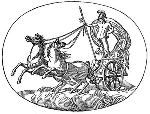 28. Mars (Ares),26 the war-god, son of Jupiter and Juno. The meaning of the name Ares is uncertain; the most probable significations are the Slayer, the Avenger, the Curse. The Roman god of war, Mars, is the bright and burning one. Homer, in the Iliad, represents Ares as the insatiable warrior of the heroic age, who, impelled by rage and lust of violence, exults in the noise of battle, revels in the horror of carnage. Strife and slaughter are the condition of his existence. Where the fight is thickest, there he rushes in without hesitation, without question as to which side is right. In battle array he is resplendent, – on his head the gleaming helmet and floating plume, on his arm the leathern shield, in his hand the redoubtable spear of bronze. Well-favored, stately, swift, unwearied, puissant, gigantic, he is still the foe of wisdom, the scourge of mortals. Usually he fights on foot, sometimes from a chariot drawn by four horses, – the offspring of the North Wind and a Fury. In the fray his sons attend him, – Terror, Trembling, Panic, and Fear, – also his sister Eris, or Discord (the mother of Strife), his daughter Enyo, ruiner of cities, and a retinue of bloodthirsty demons. As typifying the chances of war, Mars is, of course, not always successful. In the battles before Troy, Minerva and Juno bring him more than once to grief; and when he complains to Jupiter, he is snubbed as a renegade most hateful of all the gods.27 His loved one and mistress is the goddess of beauty herself. In her arms the warrior finds repose. Their daughter Harmonia is the ancestress of the unquiet dynasty of Thebes. The favorite land of Mars was, according to Homer, the rough, northerly Thrace. His emblems are the spear and the burning torch; his chosen animals are haunters of the battle field, – the vulture and the dog.