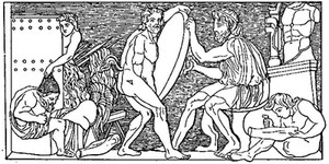 He was lame of gait, – a figurative suggestion, perhaps, of the flickering, unsteady nature of fire. According to his own story,28 he was born halt; and his mother, chagrined by his deformity, cast him from Heaven out of the sight of the gods. Yet, again,29 he says that, attempting once to save his mother from Jupiter's wrath, he was caught by the foot and hurled by the son of Cronus from the heavenly threshold: "All day I flew; and at the set of sun I fell in Lemnos, and little life was left in me." Had he not been lame before, he had good reason to limp after either of these catastrophes. He took part in the making of the human race, and in the special creation of Pandora. He assisted also at the birth of Minerva, to facilitate which he split Jupiter's head open with an ax.