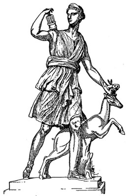 32. Diana (Artemis), twin sister of Apollo, was born on Mount Cynthus in the island of Delos. Latona, the future mother of Diana and Apollo, flying from the wrath of Juno, had besought, one after another, the islands of the Ægean to afford her a place of rest; but they feared too much the potent queen of heaven. Delos alone consented to become the birthplace of the future deities. This isle was then floating and unstable; but on Latona's arrival, Jupiter fastened it with adamantine chains to the bottom of the sea, that it might be a secure resting-place for his beloved. The daughter of Latona is, as her name Artemis indicates, a virgin goddess, the ideal of modesty, grace, and maidenly vigor. She is associated with her brother, the prince of archery, in nearly all his adventures, and in attributes she is his feminine counterpart. As he is identified with sunlight, so is she, his fair-tressed sister, with the chaste brilliance of the moon. Its slender arc is her bow; its beams are her arrows with which she sends upon womankind a speedy and painless death. In her prerogative of moon-goddess she is frequently identified with Selene, daughter of Hyperion, just as Apollo is with Helios. Despising the weakness of love, Diana imposed upon her nymphs vows of perpetual maidenhood, any violation of which she was swift and severe to punish. Graceful in form and free of movement, equipped for the chase, and surrounded by a bevy of fair companions, the swift-rushing goddess was wont to scour hill, valley, forest, and plain. She was, however, not only huntress, but guardian, of wild beasts, – mistress withal of horses and kine and other domestic brutes. She ruled marsh and mountain; her gleaming arrows smote sea as well as land. Springs and woodland brooks she favored, for in them she and her attendants were accustomed to bathe. She blessed with verdure the meadows and arable lands, and from them obtained a meed of thanks. When weary of the chase she turned to music and dancing; for the lyre and flute and song were dear to her. Muses, Graces, nymphs, and the fair goddesses themselves thronged the rites of the chorus-leading queen. But ordinarily a woodland chapel or a rustic altar sufficed for her worship. There the hunter laid his offering – antlers, skin, or edible portions of the deer that Artemis of the golden arrows had herself vouchsafed him. The holy maid, however, though naturally gracious, gentle, and a healer of ills, was, like her brother, quick to resent injury to her sacred herds or insult to herself. To this stern temper Agamemnon, Orion, and Niobe bore regretful testimony. They found that the "fair-crowned queen of the echoing chase," though blithe and gracious, was by no means a frivolous personage.