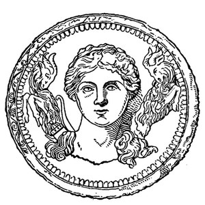 27. Minerva (Athene or Athena), the virgin goddess. She sprang from the brain of Jove, agleam with panoply of war, brandishing a spear and with her battle-cry awakening the echoes of heaven and earth. She is goddess of the lightning that leaps like a lance from the cloud-heavy sky, and hence, probably, the name Athene.25 She is goddess of the storms and of the rushing thunderbolt, and is, therefore, styled Pallas. She is the goddess of the thundercloud, which is symbolized by her tasseled breastplate of goatskin, the ægis, whereon is fixed the head of Medusa, the Gorgon, that turns to stone all beholders. She is also the goddess of war, rejoicing in martial music and protecting the war horse and the warship. On the other hand, she is of a gentle, fair, and thoughtful aspect. Her Latin name Minerva is connected with the Sanskrit, Greek, and Latin words for mind. She is eternally a virgin, the goddess of wisdom, of skill, of contemplation, of spinning and weaving, of horticulture and agriculture. She is protectress of cities, and was specially worshiped in her own Athens, in Argos, in Sparta, and in Troy. To her were sacrificed oxen and cows. The olive tree, created by her, was sacred to her, and also the owl, the cock, the serpent, and the crow.