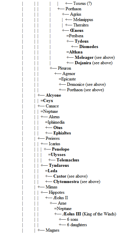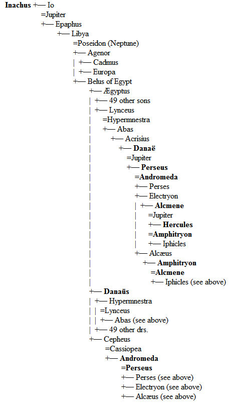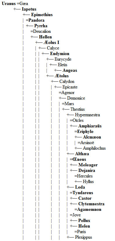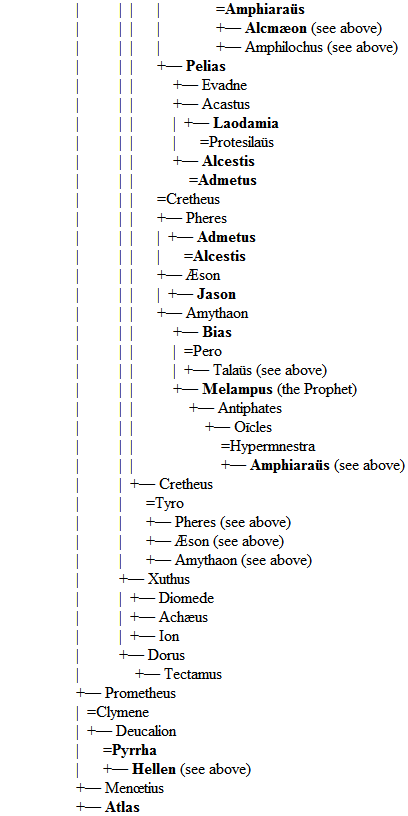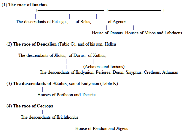 148. For the general genealogy of the race of Inachus, see Table D. For the general race of Iapetus, Deucalion, Hellen, Æolus, Ætolus, etc., see below, Table I (based in part on the table given in Roscher, article Deukalion). For the descendants of Agenor, see Table E. For the houses of Minos and of Labdacus, see Tables L and N. For the descendants of Belus (house of Danaüs), see Tables I and J; of Cecrops and Erechtheus, Table M.