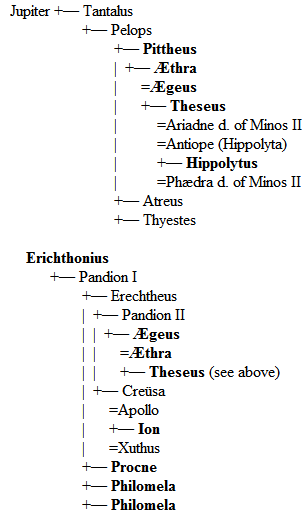 Illustrative. Chaucer, The Knight's Tale (for Theseus and Ypolita); The Hous of Fame, 407, and the Legende of Good Women, 1884, for Ariadne; Shakespeare, Two Gentlemen of Verona, IV, i; Midsummer Night's Dream, II, ii (Hippolyta and Theseus); Shakespeare and Fletcher, Two Noble Kinsmen. In Beaumont and Fletcher's Maid's Tragedy, II, ii, a tapestry is ordered to be worked illustrating Theseus' desertion of Ariadne. Landor, To Joseph Ablett, "Bacchus is coming down to drink to Ariadne's love"; Landor, Theseus, and Hippolyta; Mrs. Browning, Paraphrase on Nonnus (Bacchus and Ariadne), Paraphrase on Hesiod; Sir Theodore Martin, Catullus, LXIV. Other poems: B. W. Procter, On the Statue of Theseus; Frederick Tennyson, Ariadne (Daphne and Other Poems); Mrs. Hemans, The Shade of Theseus; R. S. Ross, Ariadne in Naxos; J. S. Blackie, Ariadne; W. M. W. Call, Ariadne; Mrs. H. H. Jackson, Ariadne's Farewell. Phædra and Hippolytus: The Hippolytus of Euripides; Swinburne, Phædra; Browning, Artemis Prologizes; M. P. Fitzgerald, The Crowned Hippolytus; A. Mary F. Robinson, The Crowned Hippolytus; L. Morris, Phædra (Epic of Hades). On Cecrops: J. S. Blackie, The Naming of Athens; Erechtheus, by A. C. Swinburne.