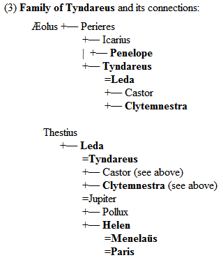 Castor and Pollux are called sometimes Dioscuri (sons of Jove), sometimes Tyndaridæ (sons of Tyndareus). Helen is frequently called Tyndaris, daughter of Tyndareus.
