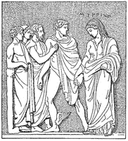 36. Mercury (Hermes), born in a cave of Mount Cyllene in Arcadia, was the son of Jupiter and Maia (the daughter of Atlas). According to conjecture, his name Hermes means the Hastener. Mercury, swift as the wind, was the servant and herald of Jupiter and the other gods. On his ankles (in plastic art), and his low-crowned, broad-brimmed petasus, or hat, were wings. As messenger of Heaven, he bore a wand (caduceus) of wood or of gold, twined with snakes and surmounted by wings, and possessed of magical powers over sleeping, waking, and dreams. He was beautiful and ever in the prime of youthful vigor. To a voice sweet-toned and powerful, he added the persuasiveness of eloquence. But his skill was not confined to speech; he was also the first of inventors – to him are ascribed the lyre and the flute. He was the forerunner, too, of mathematicians and astronomers. His agility and strength made him easily prince in athletic pursuits. His cunning rendered him a dangerous foe; he could well play the trickster and the thief, as Apollo found out to his vexation, and Argus, and many another unfortunate. His methods, however, were not always questionable; although the patron of gamblers and the god of chance, he, at the same time, was the furtherer of lawful industry and of commerce by land and sea. The gravest function of the Messenger was to conduct the souls of the dead, "that gibber like bats as they fare, down the dank ways, past the streams of Oceanus, past the gates of the sun and the land of dreams, to the mead of asphodel in the dark realm of Hades, where dwell the souls, the phantoms of men outworn."37