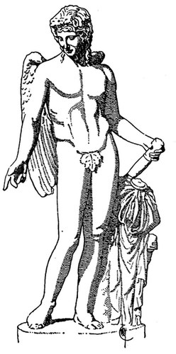 1. Cupid (Eros), small but mighty god of love, the son of Venus and her constant companion. He was often represented with eyes covered because of the blindness of his actions. With his bow and arrows, he shot the darts of desire into the bosoms of gods and men. Another deity named Anteros, reputed the brother of Eros, was sometimes represented as the avenger of slighted love, and sometimes as the symbol of reciprocal affection. Venus was also attended at times by another brother of Eros, Himeros, or Longing, and by Hymen, a beautiful youth of divine descent, the personification of the wedding feast and leader of the nuptial chorus. Of Eros the poet Gosse writes: