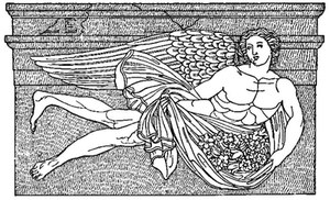 9. The Winds, – Boreas, or Aquilo, the north wind; Zephyrus, or Favonius, the west; Notus, or Auster, the south; and Eurus, the east. The first two, chiefly, have been celebrated by the poets, the former as the type of rudeness, the latter of gentleness. It is said that Boreas loved the nymph Orithyia and tried to play the lover's part, but met with poor success; for it was hard for him to breathe gently, and sighing was out of the question.