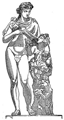 42. Bacchus (Dionysus), the god of wine, was the son of Jupiter and Semele, daughter of Cadmus of Thebes. He was especially the god of animal life and vegetation. He represented not only the intoxicating power of wine but its social and beneficent influences, and was looked upon as a promoter of civilization, a lawgiver, and a lover of peace. His forehead was crowned with vine leaves or ivy. He rode upon the tiger, the panther, or the lynx, or was drawn by them in a car. His worshipers were Bacchanals, or Bacchantes. He was attended by Satyrs and Sileni and by women called Mænads, who, as they danced and sang, waved in the air the thyrsus, a staff entwined with ivy and surmounted by a pine cone. Ordinarily, as in the following verses by Dryden, the convivial qualities of the god overshadow all the rest: