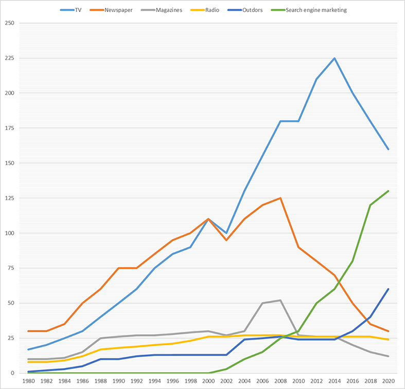 3) Глобальный рынок рекламы достиг свой предельной полезности. В стоимостном выражении расходы на рекламу поступательно увеличиваются на протяжении последних десятилетий. На рисунке 1.1 представлена динамика затрат по основным рекламным каналам за прошедшие сорок лет. Как видно, имеется два положительных тренда: растут расходы на поисковый маркетинг (Search engine marketing, SEM) и наружную рекламу (Outdors); три нисходящих – телевидение (TV), газеты (Newspaper), журналы (Magazines); и один стабильный – радио (Radio).