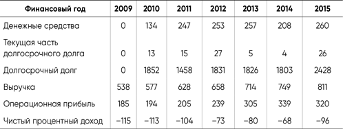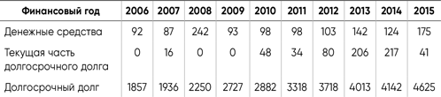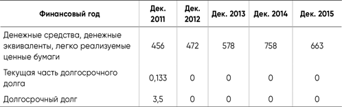 Такие компании либо совсем не имеют долгов, либо имеют минимальный долг. Например, компания Chipotle Mexican Grill. Ее прибыль выросла на 30 % без привлечения займов. Ниже приведены соответствующие статьи баланса компании Chipotle за последние пять лет (в млн $):