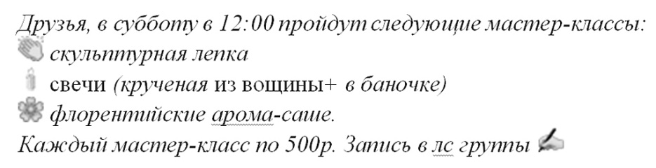 Однако немного эмодзи все же можно использовать. Выберите от 5 до 10 символов, которые вы будете время от времени использовать. Они будут вашими характерными помощниками на протяжении всей жизни вашей группы или страницы, поэтому выбирайте тщательно. От 1 до 2 символов в тексте будет достаточно для акцентирования внимания, если все же возникла потребность, а если ее нет – то лучше вообще воздержаться от смайлов.