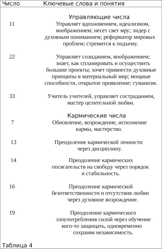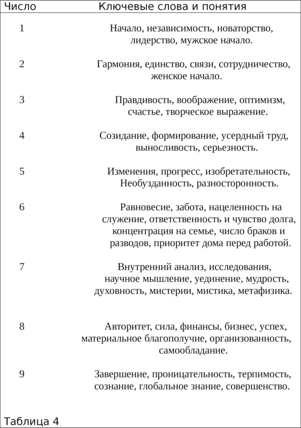 Примечание: В русской нумерологии буквы И, Й и Ы считаются одинаковой вибрацией 9, буквы Ъ и Ь собственных вибраций не имеют и поэтому при подсчете не учитываются. Каждое число имеет особое значение. Ниже представлена таблица значений отдельных чисел «на скорую руку» (таблица 4).