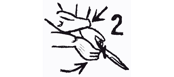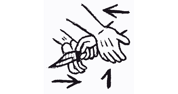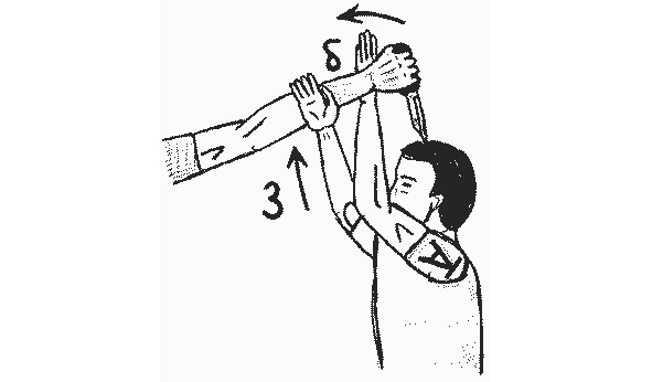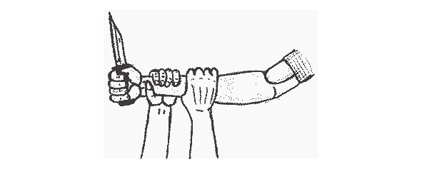 Удар ножом, особенно внезапный, наносится очень быстро, поэтому большое значение для защищающегося имеет умение парировать такие удары с последующим захватом вооруженной руки. Делать это лучше с помощью «ножниц» – блока двумя руками, движущимися навстречу друг другу (рис 5—6).