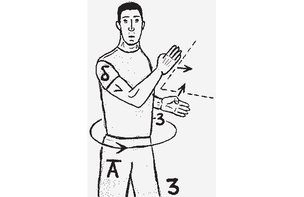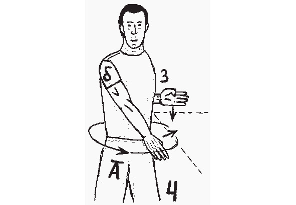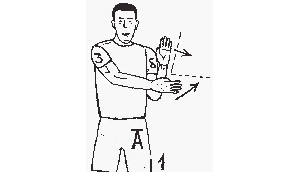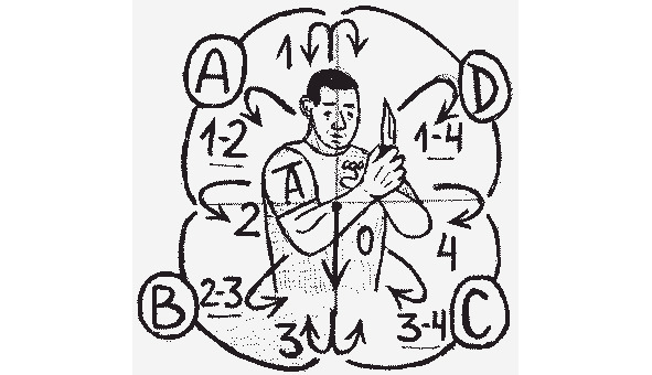 На рисунке 4 показаны основные траектории ударов ножом. Их можно уловно поделить на 5 основных групп. Группа 0 – прямые колющие удары, а остальные – боковые и диагональные, колющие и режущие. Защита от ударов, относящихся к одной группе, выполняется одинаково. Удары сверху (1) и снизу (3) можно отнести сразу к обеим соседним группам и, соответственно, защищаться от них можно двумя различными способами.