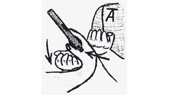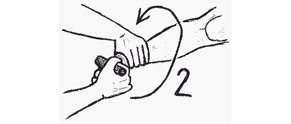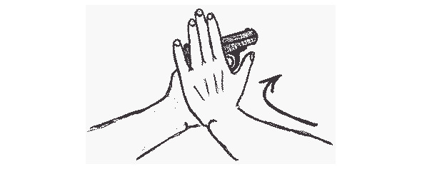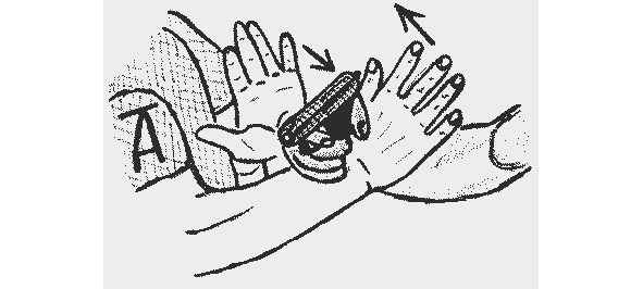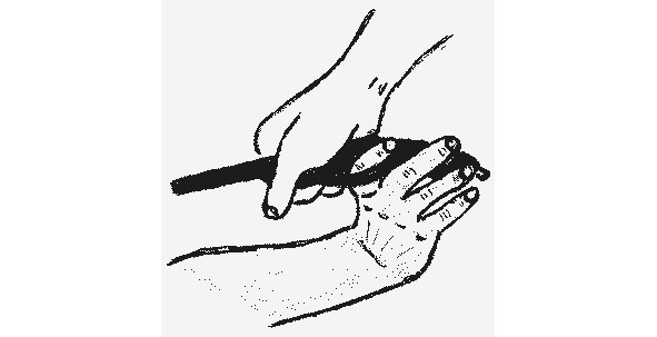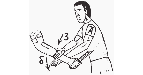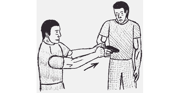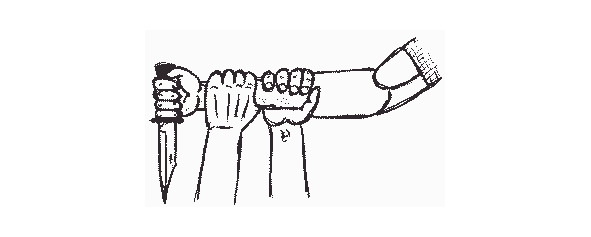 Выбить нож из рук противника можно любым предметом, рукой или ногой. Достаточно ударить в нужный момент времени в нужное место руки противника. Но, нанося подобный удар, надо иметь в виду, что противнику гораздо легче ранить вашу руку или ногу, чем вам выбить у него нож. Тем не менее, именно техника выбивания больше всего подходит для самообороны. Использование при этом подручных средств может существенно обезопасить контакт с оружием преступника. Нож можно выбить предметом, имеющимся в руках или оказавшимся под рукой. В крайнем случае, рукой или ногой. При этом безопаснее всего наносить удары местами, надежно прикрытыми одеждой или обувью. Кроме того, если в завязавшейся борьбе удалось надежно захватить атакующую руку противника, то можно несколько раз ударить ей о твердые поверхности или острые грани окружающих предметов. Выбивая нож основанием ладони голой руки, следует бить по боковой его части, по незаточенному ребру клинка. На рисунке 3 показан один из способов выбивания ножа.