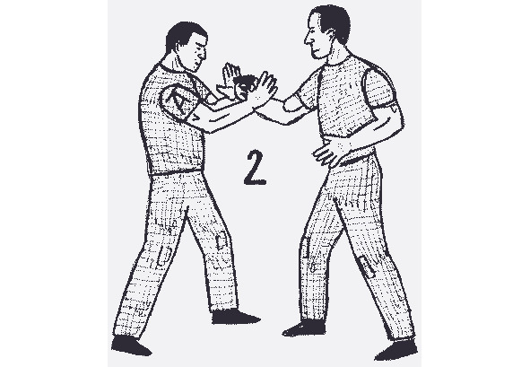 При одновременном блокировании ударов ножом или палкой ребрами ладоней обеих рук, последующий захват запястья вооруженной ножом кисти врага выполняется путем «переката» ближнего к запястью неприятеля ладони (супинация или пронация) с ребра на область между большим и указательным пальцами («вилка») и зажимом ею (рис 10). По похожему принципу, с отбивом одной рукой, захватывается вооруженная пистолетом рука врага, когда тот угрожает защищающемуся своим оружием вплотную (рис 11). При этом ладонью одной руки вражеская рука с пистолетом сбивается в сторону (1), после чего «вилка» второй руки тут же обхватывает нижнее ребро удерживающей пистолет руки неприятеля (2). И сразу же захват вооруженной руки врага усиливается при помощи захвата «вилкой» другой руки запястья злоумышленника (2).