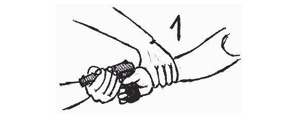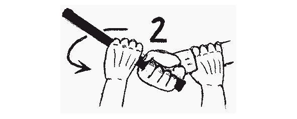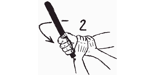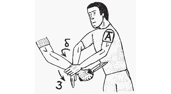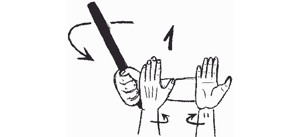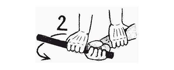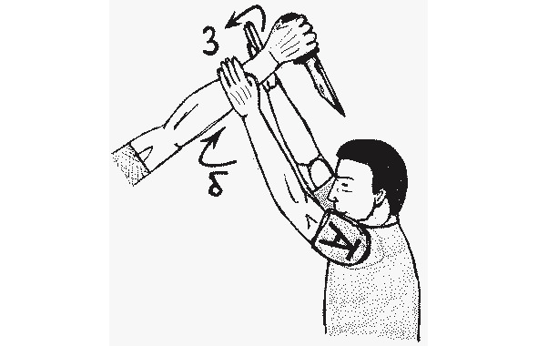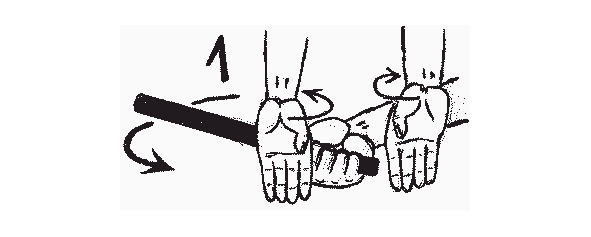При выкручивании дубинки наружу (рис 16-а) нужно захватить одной рукой вражескую кисть и потянуть ее на себя (2). Другой рукой следует захватить центральную часть дубинки и движением по дуге от себя и вниз вывернуть оружие из неприятельских рук (1).