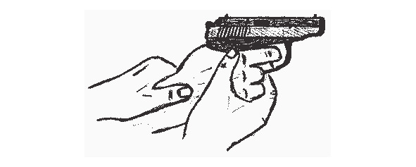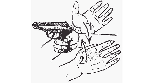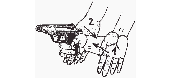 При выполнении приемов защиты от противника, угрожающего автоматическим пистолетом в упор, следует обратить особое внимание на захват руки с оружием. При выстреле затвор таких пистолетов, как правило, идет назад с такой силой, что сорвет любой захват и травмирует руку защищающегося. Ствол пистолета должен быть всегда направлен в сторону от вас. Лучше всего контролировать оружие в руках противника двумя руками. Выполняя обезоруживание, следует особое внимание уделить направлению ствола пистолета и постоянно его контролировать.