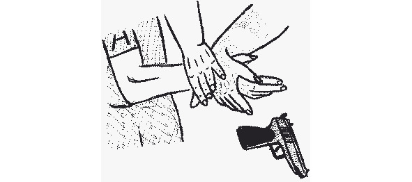 На рисунке 13 показан вариант отъема пистолета при помощи дожима вооруженной пистолетом руки противника внутрь. В этом случае, как и во всех других, первым движением защищающегося становится шаг-поворот наружу или внутрь вражеской стойки в сочетании с отбивом его вооруженной руки в сторону. Сразу после отбива одной рукой вооруженной руки нападающего нужно другой рукой захватить ее запястье. Прижав вооруженную руку нападающего к своему корпусу, нужно свободной рукой нанести неприятелю несколько ударов локтем в лицо (1), после чего отобрать оружие из его руки (2,3). Для этого кладем правую руку на верхнюю часть оружия и выкручиваем его так, чтобы дуло пистолета двигалось на преступника и вниз. Как только пистолет окажется у вас, можно напоследок ударить им преступника по голове (4) и сразу бежать с места нападения. Недостатком данного приема является недостаточная быстрота исполнения, что делает его выполнение затруднительным при защите от нескольких преступников.