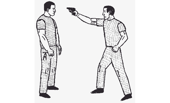 Практически невозможно защититься от противника, вооруженного огнестрельным оружием, если он стреляет без промедления, либо угрожает пистолетом с расстояния, которое нельзя быстро преодолеть. Однако, если преступник не стреляет сразу, значит он хочет что-то потребовать от своей жертвы. В такой ситуации злоумышленник начнет стрелять только тогда, когда почувствует угрозу своей безопасности. Поэтому нужно изобразить покорность, поднять руки вверх и попытаться приблизиться к нападающему на дистанцию, позволяющую провести прием.