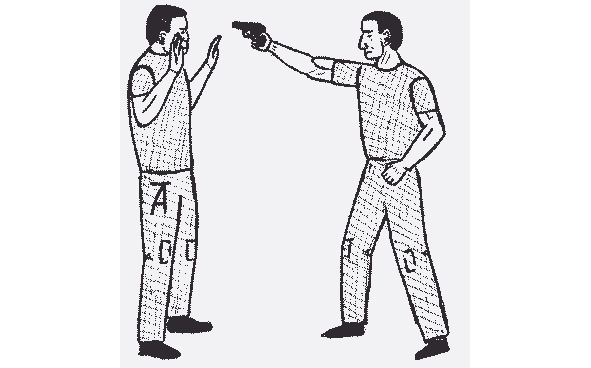 Предположим, что преступник, угрожая, держит пистолет возле лица, или верхней части груди своей жертвы (рис 1). В этом случае защищающийся может попытаться выбить оружие из рук злоумышленника. Делается это следующим образом – сперва, изображая покорность, нужно поднять руки вверх (1). Затем голова резко убирается с линии выстрела, а руки перекрестным движением выбивают пистолет из вражеских рук (2). Верхним ребром правой ладони при этом защищающийся бьет по внутренней стороне вражеского запястья, а левой ладонью – по тыльной части вражеской ладони (3,4). Уклон головой производится наружу стойки противника – то есть влево, если преступник держит свое оружие в правой руке. Очень важно, чтобы нападающий не ожидал от своей жертвы сопротивления и не успел убрать руку раньше, чем та попытается провести свой прием. Поэтому важно с самого начала следует изобразить покорность и подчинение, усыпив бдительность злоумышленника. Таким же способом можно защищаться, когда преступник держит свой пистолет возле виска своей жертвы. В данном случае, перед проведением приема, защищающемуся следует поднять руки вверх и медленно повернуться к неприятелю лицом.