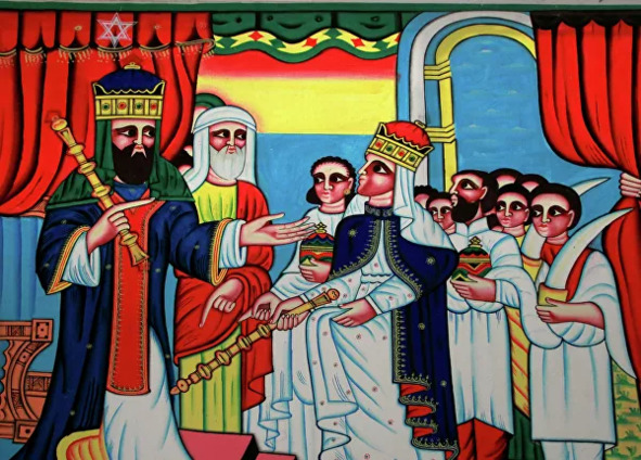 © Археологический музей Аксума Встреча царя Соломона с царицей Савской. Картина из музея Аксума. Эфиопия