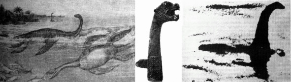 На иллюстрации: слева направо: реконструкция плезиозавров – вырезанная голова дракона с судна викингов, найденное в Норвегии – снимок Лох-Несского чудовища
