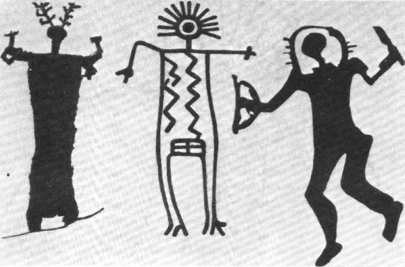 Till vänster: figuren av en präst från Val Camonica (norra Italien). är han inte en läkare med en antenn på huvudet? I mitten: en bild av en präst från Inyo County från Kalifornien, kanske också i en skyddsdräkt? Till höger: "cosmonaut doctor" från rockmålningar i Val Camonica.