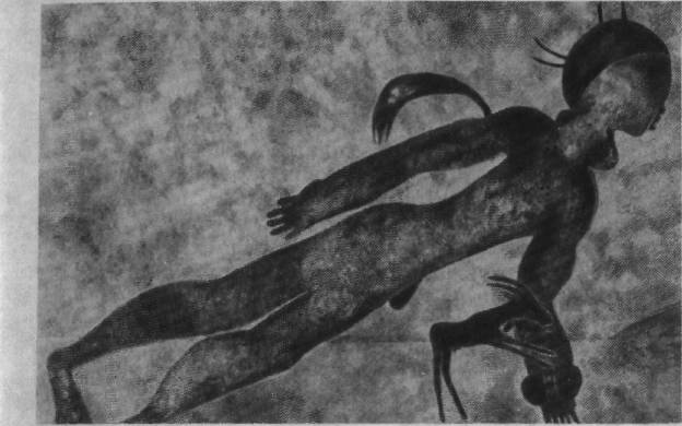 En fresco från Sefar (Sahara-regionen nära Tassili). På toppen är en figur som liknar en dykare eller en läkare i en speciell kostym. Nedan är en" Martian " eller en man i skyddsdräkt.