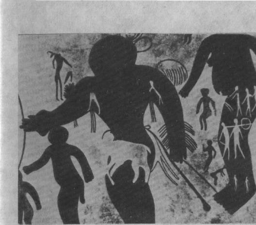 Denna fresco från Jabbaren, Tassili, gömdes under ett tätt lager av skifferdamm. Är det möjligt att säga att de enorma figurerna som visas på den är klädda i speciella overaller? Vissa experter tror att det finns ritade pilar från bågen med fjädrar på huvudet.