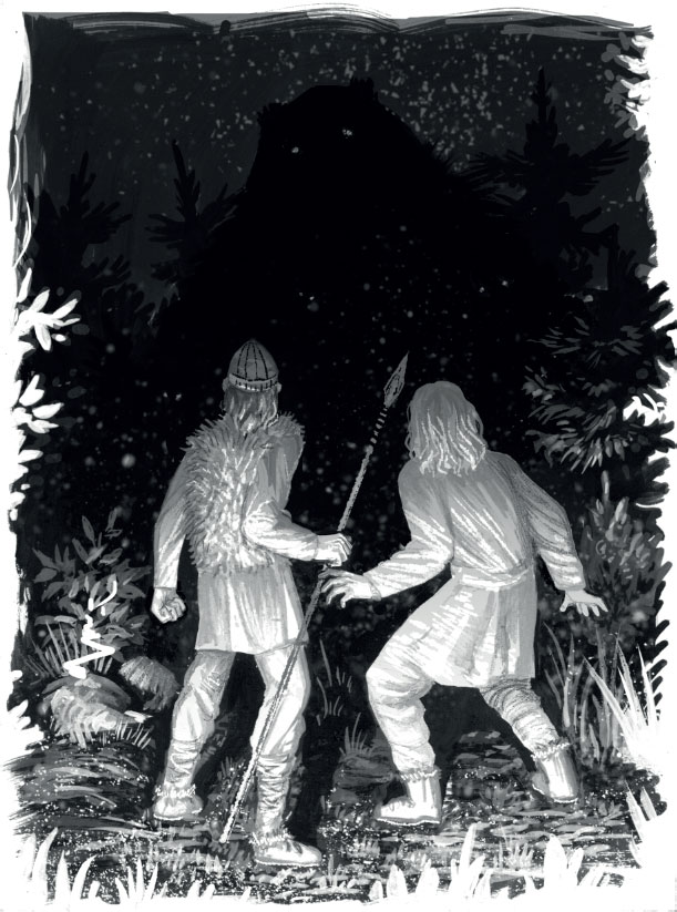 В шалаше зашевелился Алмори. И тут же тьма всколыхнулась у самого куваса. Нечто чёрное, кудлатое задвигалось, засопело и отшатнулось, отплыло в сторону и исчезло. Алмори что-то мычал спросонья, шелестел ветками подстилки. Атхо хотел было окликнуть его, упредить, но голос сорвался, осёкся, в уголках глаз выступили слёзы. Охотник, превозмогая оцепенение, на негнущихся ногах медленно зашагал к шалашу, не отрывая глаз от матового мрака позади себя. Он понимал, что того, кто бродит вокруг стоянки, может отпугнуть только хёнки в союзе с огнём. Он не мог противостоять порыву поскорее добраться до оружия, сжимая в руках которое он всегда чувствовал себя в относительной безопасности. Да и брата нужно выручать – слишком близко подкралась опасность.