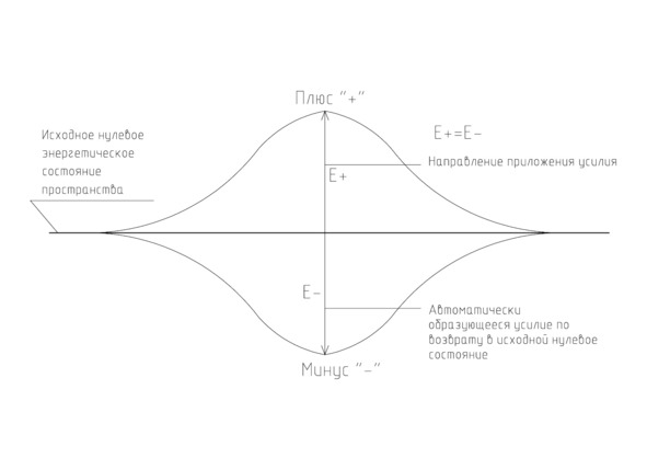 Давайте прикладываемое к струне усилие по ее уводу от изначального нулевого энергетического состояния обозначим как «плюс» (+), а усилие, которое автоматически возникает в стремлении вернуть струну в изначальное состояние, как «минус» (-).