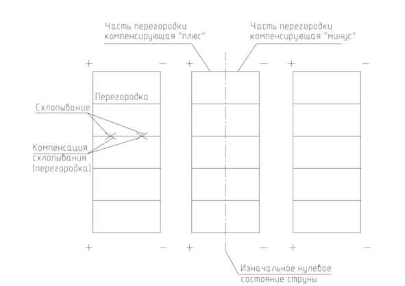 В результате мы получаем обособленные энергетические элементы, которые никак не контактируют друг с другом. Перегородка своего рода компенсирует энергию оттянутой струны. В данном случае наблюдается полная симметрия представленной конструкции.