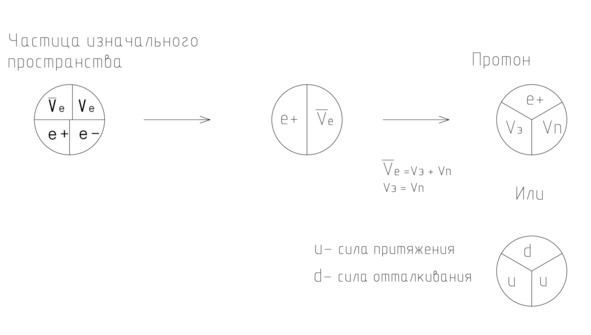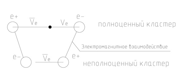 Тогда внутреннюю структуру кластера, полученного после Большого взрыва, можно представить как некое обособленное состояние, содержащее в себе протон и электрон. При этом протон состоит из позитрона и антинейтрино.