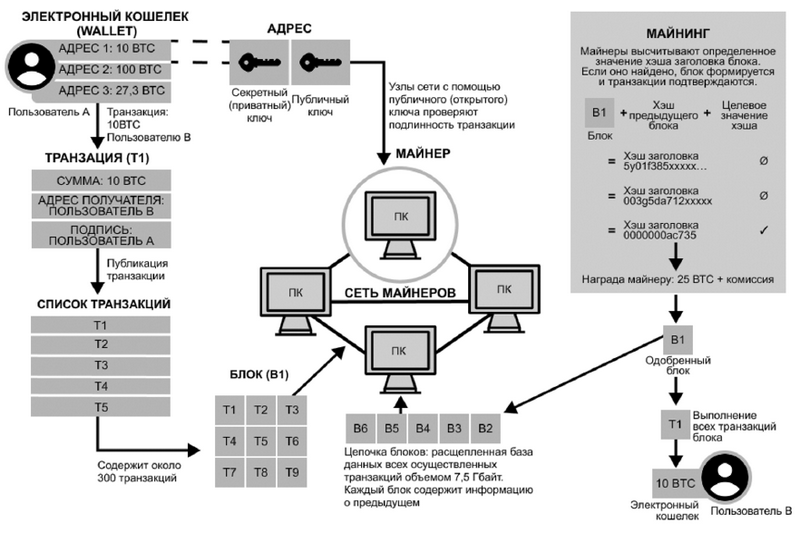 Время создания блока в биткоине – около 10 минут, и каждые 10 минут создается новый блок. На рис. 1 это номера блоков, обозначенные буквами N+. При этом все блоки идут последовательно, и изменять что-то задним числом нельзя. С одной стороны, это плюс, потому что исключается возможность подделки документов или махинаций. С другой стороны, это же и минус, потому что если вы отправили перевод не туда, то «откатить» его, отменить уже не получится. Подробнее о транзакциях мы поговорим далее.